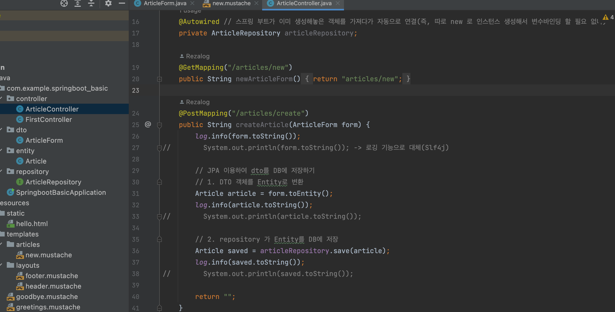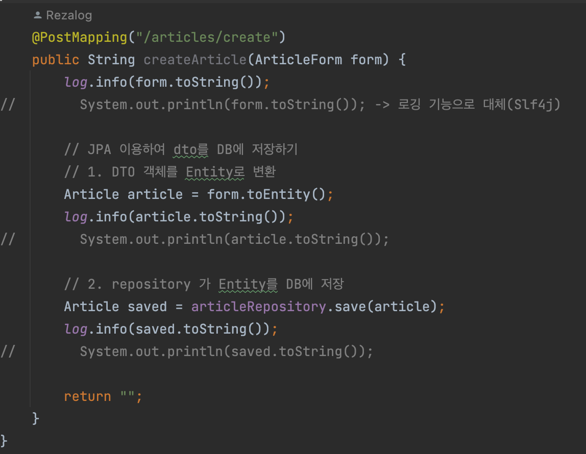ArticleController : /articles/create POST 요청 시, toEntity 메소드로 DTO인 ArticleForm을 변환 후 CrudRepository 인터페이스를 상속한 articleRepository의 save 메소드로 Entity로 변환된 DTO를 save한다. log.info는 @Slf4j 로 로깅하여 리팩토링하였다.