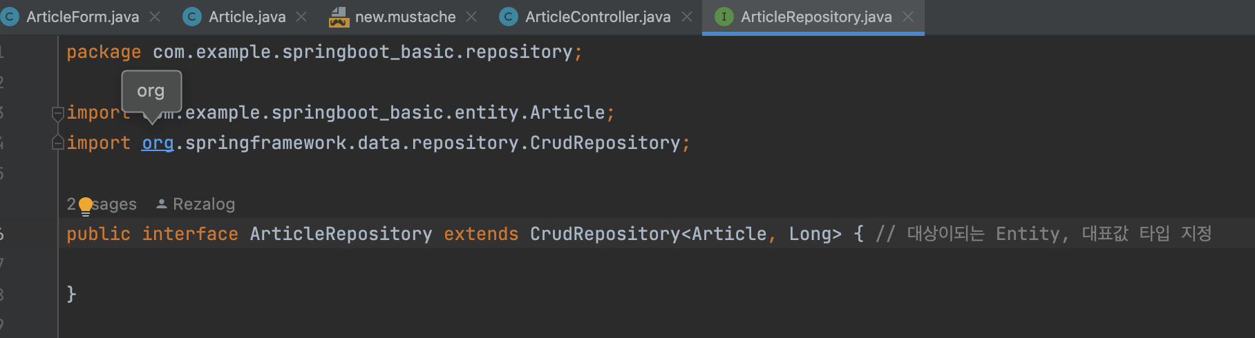 ArticleRepository : CrudRepository 인터페이스를 상속하여 Entity타입인 Article타입과 Entity의 대표값인 id 의 타입인 Long 타입을 넘겨준다