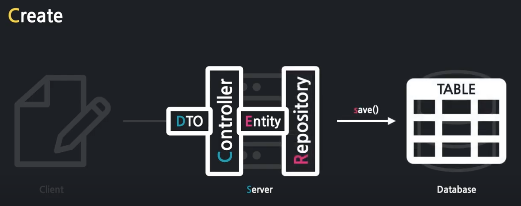 즉, DTO를Entity로전환하고, Entity를Repository로저장하는형태이다.