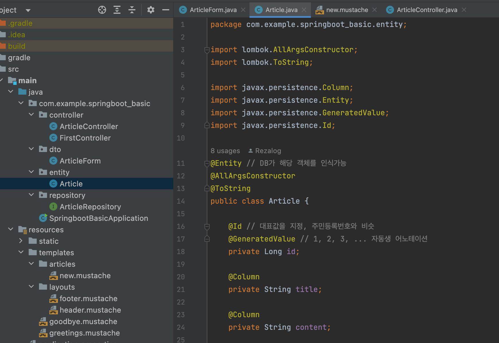 Article : ArticleController에서 /articles/new/create POST 요청시, DTO를 @Entity 로 변환하기 위해 Entity를 위한 class 를 생성