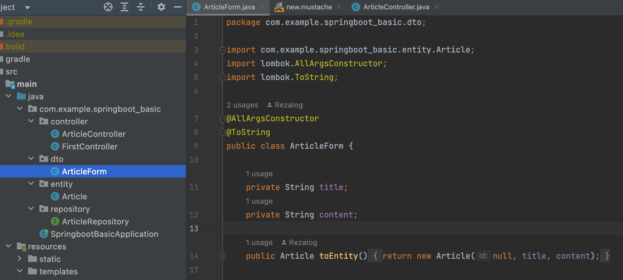 ArticleForm : DTO, @AllArgsConstrucor와 @ToString 으로 생성자와 toString 메소드를 생성, toEntity 메소드로 DB에 저장하기 위한 Entity 로 변환한다.